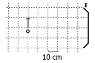Na figura, E representa um espelho esférico côncavo com distância focal de 20 cm, e O, um objeto extenso colocado a 60 cm do vértice do espelho.
