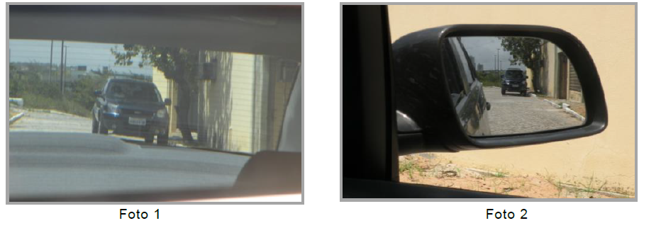 A (UFRN 2011) Os carros modernos usam diferentes tipos de espelhos retrovisores, de modo que o motorista possa melhor observar os veículos que se aproximam por trás dele. As Fotos 1 e 2 abaixo mostram as imagens de um veículo estacionado, quando observadas de dentro de um carro, num mesmo instante, através de dois espelhos: o espelho plano do retrovisor interno e o espelho externo do retrovisor direito, respectivamente.