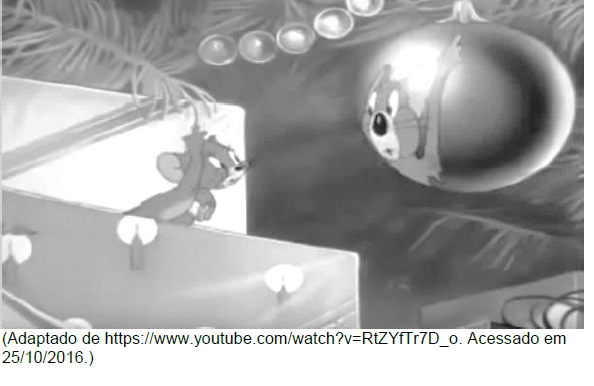 B (UNICAMP 2017) Em uma animação do Tom e Jerry, o camundongo Jerry se assusta ao ver sua imagem em uma bola de Natal cuja superfície é refletora, como mostra a reprodução abaixo. É correto afirmar que o efeito mostrado na ilustração não ocorre na realidade, pois a bola de Natal formaria uma imagem