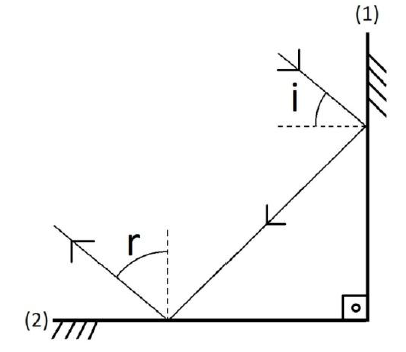 B (UFU 2013) Uma pessoa, brincando com um apontador laser, emite um feixe de luz na direção de um espelho plano (1), perpendicular a um outro (2), de mesma natureza. O caminho do raio é ilustrado na figura a seguir.