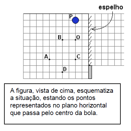 E (FUVEST 2004) Desejando fotografar a imagem, refletida por um espelho plano vertical, de uma bola, colocada no ponto P, uma pequena máquina fotográfica é posicionada em O, como indicado na figura, registrando uma foto. Para obter outra foto, em que a imagem refletida da bola apareça com diâmetro duas vezes menor, dentre as posições indicadas, a máquina poderá ser posicionada somente em