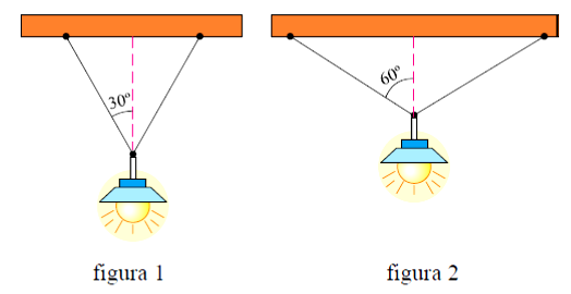 B (VUNESP 2011) Um lustre está pendurado no teto de uma sala por meio de dois fios inextensíveis, de mesmo comprimento e de massas desprezíveis, como mostra a figura 1, onde o ângulo que cada fio faz com a vertical é 30°. As forças de tensão nos fios têm a mesma intensidade.