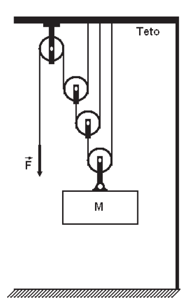 C (ESPCEX 2009) Um trabalhador utiliza um sistema de roldanas conectadas por cordas para elevar uma caixa de massa M = 60 kg. Aplicando uma força F sobre a ponta livre da corda conforme representado no desenho abaixo, ele mantém a caixa suspensa e em equilíbrio. Sabendo que as cordas e as roldanas são ideais e considerando a aceleração da gravidade igual a 10 m/s2, o módulo da força F vale