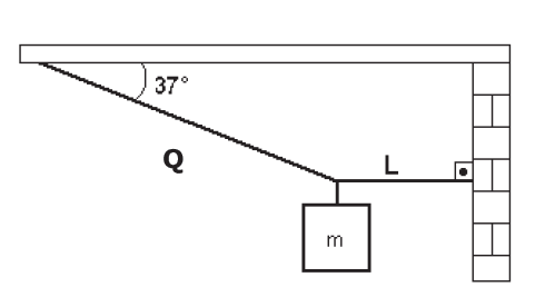 A corda L forma um ângulo de 90° com a parede e a corda Q forma um ângulo de 37° com o teto. Considerando a aceleração da gravidade igual a 10 m/s2, o valor da força de tração que a corda L exerce na parede é de: