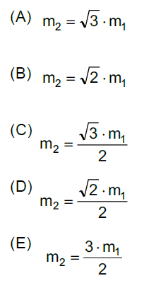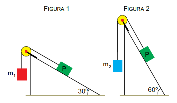 A (FCMSCSP 2018) Um prisma triangular pode ser apoiado sobre uma superfície horizontal de duas maneiras diferentes. Na primeira, para manter em repouso um corpo de peso P, é necessário ligá-lo por meio de um fio a um corpo de massa m1 (figura 1). Na segunda, para manter o mesmo corpo em repouso, é necessário ligá-lo a um corpo de massa m2 (figura 2).