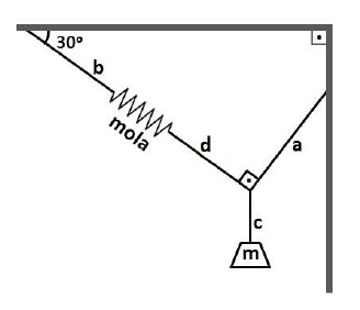 A (UFPR 2017) Uma mola de massa desprezível foi presa a uma estrutura por meio da corda “b”. Um corpo de massa “m” igual a 2000 g está suspenso por meio das cordas “a”, “c” e “d”, de acordo com a figura ao lado, a qual representa a configuração do sistema após ser atingido o equilíbrio. Considerando que a constante elástica da mola é 20 N/cm e a aceleração gravitacional é 10 m/s2, assinale a alternativa que apresenta a deformação que a mola sofreu por ação das forças que sobre ela atuaram, em relação à situação em que nenhuma força estivesse atuando sobre ela. Considere ainda que as massas de todas as cordas e da mola são irrelevantes.