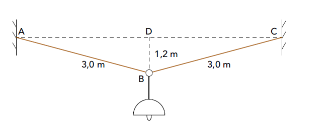 C (UERJ 2018) Uma luminária com peso de 76 N está suspensa por um aro e por dois fios ideais. No esquema, as retas AB e BC representam os fios, cada um medindo 3 m, e D corresponde ao ponto médio entre A e C.