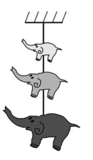 A (FUVEST 2012) Um móbile pendurado no teto tem três elefantezinhos presos um ao outro por fios, como mostra a figura. As massas dos elefantes de cima, do meio e de baixo são, respectivamente, 20 g, 30 g e 70 g. Os valores de tensão, em newtons, nos fios superior, médio e inferior são, respectivamente, iguais a