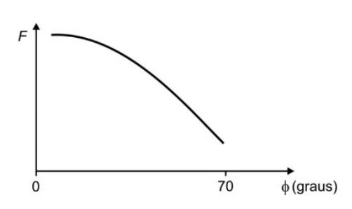 E (FUVEST 2012) O gráfico abaixo representa a força F exercida pela musculatura eretora sobre a coluna vertebral, ao se levantar um peso, em função do ângulo Φ, entre a direção da coluna e a horizontal. Ao se levantar pesos com postura incorreta, essa força pode se tornar muito grande, causando dores lombares e problemas na coluna.