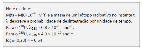 O 235U decai mais rapidamente que o 238U; na Terra, atualmente, a fração do isótopo 235U, em relação ao 238U, é cerca de 0,7%. Com base nessas informações e nos dados fornecidos, pode-se estimar que o reator natural tenha estado em operação há