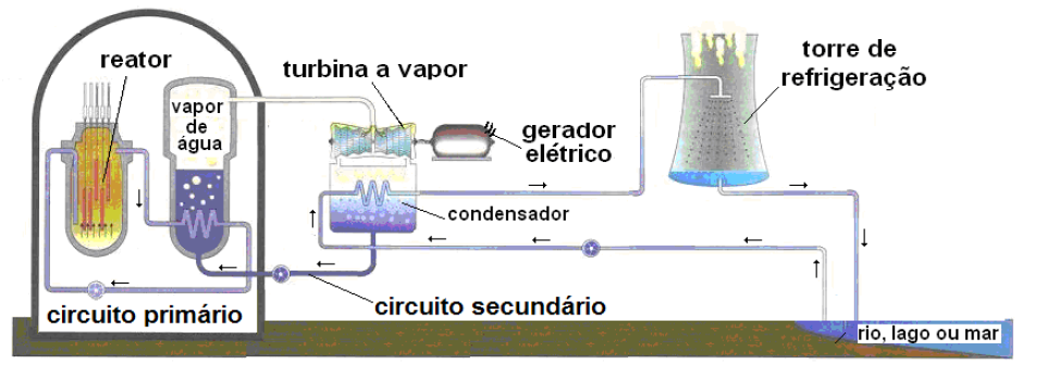 D (UFRN 2010) As usinas nucleares funcionam a partir da grande quantidade de calor liberada pelas reações nucleares. O calor é absorvido por um circuito de água primário, do tipo ciclo fechado. Esse circuito fica em contato com outro, o circuito secundário, que, por sua vez, produz vapor de água a alta pressão, para fazer girar uma turbina capaz de acionar um gerador elétrico, conforme mostra, esquematicamente, a figura abaixo.