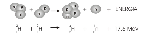 Por exemplo, quando, o trítio e o deutério (isótopos do hidrogênio) se combinam, formam um núcleo de hélio e um nêutron, cada um deles com grande energia cinética, a qual é transformada em calor e aproveitada para gerar energia elétrica.