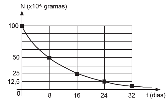 O iodo 131, por exemplo, é um radioisótopo utilizado no tratamento de hipertireoidismo. O gráfico abaixo representa a massa residual de iodo 131 (N) presente em uma amostra em função do tempo (t).