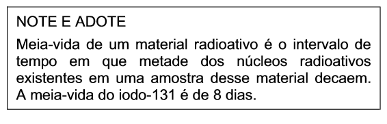 D (FUVEST 2012) A seguinte notícia foi veiculada por ESTADAO.COM.BR/Internacional na terça-feira, 5 de abril de 2011: TÓQUIO – A empresa Tepco informou, nesta terça-feira, que, na água do mar, nas proximidades da usina nuclear de Fukushima, foi detectado nível de iodo radioativo cinco milhões de vezes superior ao limite legal, enquanto o césio-137 apresentou índice 1,1 milhão de vezes maior. Uma amostra recolhida no início de segunda-feira, em uma área marinha próxima ao reator 2 de Fukushima, revelou uma concentração de iodo-131 de 200 mil becquerels por centímetro cúbico. Se a mesma amostra fosse analisada, novamente, no dia 6 de maio de 2011, o valor obtido para a concentração de iodo-131 seria, aproximadamente, em Bq/cm3,