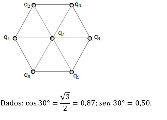 (MAUÁ 2012) Seis cargas puntiformes q1 = +2Q, q2 = +Q, q3 = –3Q, q4 = –2Q, q5 = +Q e q6 = –3Q são fixadas nos vértices de um hexágono regular de lado L, como mostra a figura. Uma sétima carga q7 = +4Q é colocada no centro do hexágono.
