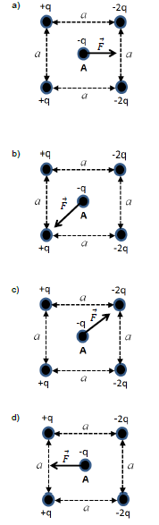 (UNICAMP 2014)  A atração e a repulsão entre partículas carregadas têm inúmeras aplicações industriais, tal como a pintura eletrostática. As figuras abaixo mostram um mesmo conjunto de partículas carregadas, nos vértices de um quadrado de lado a, que exercem forças eletrostáticas sobre a carga A no centro desse quadrado. Na situação apresentada, o vetor que melhor representa a força resultante agindo sobre a carga A se encontra na figura