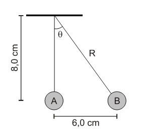 A (IFSC 2011)  Um pêndulo elétrico de comprimento R e massa m = 0,2 kg, eletrizado com carga Q positiva, é repelido por outra carga igual, fixa no ponto A. A figura mostra a posição de equilíbrio do pêndulo.