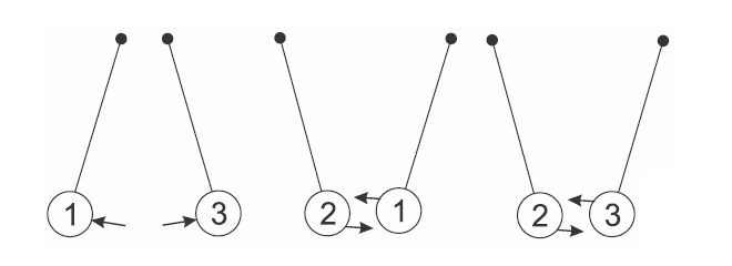 B (UFJF-PISM 3 2017) Em uma experiência realizada em sala de aula, o professor de Física usou três esferas metálicas, idênticas e numeradas de 1 a 3, suspensas por fios isolantes em três arranjos diferentes, como mostra a figura abaixo: