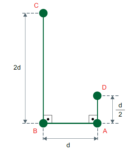 B (FCMSCSP 2018) Quatro cargas puntiformes idênticas (A, B, C e D) estão fixas e dispostas conforme a figura. As forças de repulsão entre A e B, A e C e entre A e D são, respectivamente, FAB, FAC e FAD.