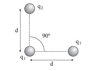 distância d, é F. Suponha em seguida que uma carga q1 = q seja colocada frente a duas outras cargas, q2 = 3q e q3 = 4q, segundo a disposição mostrada na figura.