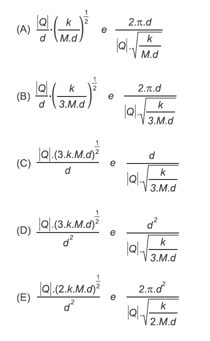 A (FMABC 2015) Uma partícula de massa M e carga elétrica igual a – Q descreve um movimento circular e uniforme em torno de outra partícula fixa de massa igual a 2M e carga + Q. A distância entre os centros de massas dessas partículas vale d e a constante eletrostática do meio vale k. Com base nesses dados determine, respectivamente, a velocidade angular (ω) e o período (T) da