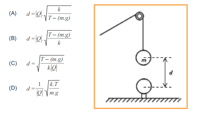 A (FACULDADE DE MEDICINA ALBERT EINSTEIN 2017) Observe a figura abaixo onde duas esferas de massas iguais a m estão eletrizadas com cargas elétricas Q, iguais em módulo, porém de sinais contrários. Estando o sistema em equilíbrio estático, determine a distância d entre os centros das esferas. Adote o módulo da aceleração da gravidade igual a g, a constante eletrostática do meio igual a k e a tração na corda igual a T.