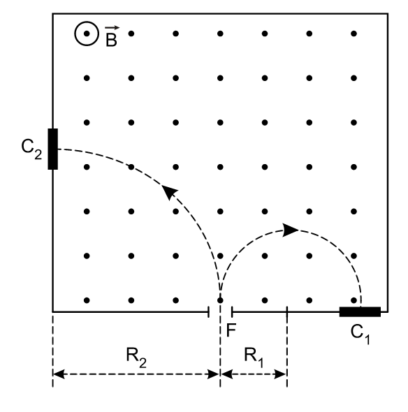 (UNESP 2013) Um feixe é formado por íons de massa m1 e íons de massa m2, com cargas elétricas q1 e q2, respectivamente, de mesmo módulo e de sinais opostos. O feixe penetra com velocidade v por uma fenda F, em uma região onde atua um campo magnético uniforme B cujas linhas de campo emergem na vertical perpendicularmente ao plano que contém a figura e com sentido para fora. Depois de atravessarem a região por trajetórias tracejadas circulares de raios R1 e R2 = 2.R1 desviados pelas forças magnéticas que atuam sobre eles, os íons de massa m1 atingem a chapa fotográfica C1 e os de massa m2 a chapa C2.