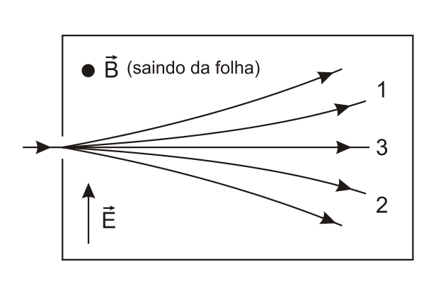 E (FUVEST 2014) Partículas com carga elétrica positiva penetram em uma câmara em vácuo, onde há, em todo seu interior, um campo elétrico de módulo E e um campo magnético de módulo B, ambos uniformes e constantes, perpendiculares entre si, nas direções e sentidos indicados na figura. As partículas entram na câmara com velocidades perpendiculares aos campos e de módulos v1 (grupo 1), v2 (grupo 2) e v3 (grupo 3). As partículas do grupo 1 têm sua trajetória encurvada em um sentido, as do grupo 2, em sentido oposto, e as do grupo 3 não têm sua trajetória desviada. A situação está ilustrada na figura abaixo.
