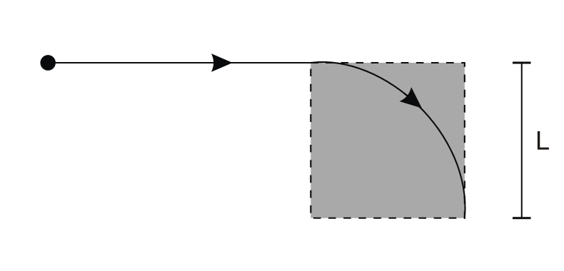 (UFPE 2013) Uma partícula de massa m e carga q ingressa, com velocidade horizontal de módulo v = 1500 km/s na extremidade superior esquerda da região acinzentada quadrada de lado L = 1 mm (ver figura). Nesta região acinzentada existe um campo magnético uniforme, de módulo B = 2 T e direção perpendicular à velocidade inicial da partícula e ao plano da página. A partícula deixa a região acinzentada quadrada na extremidade inferior direita. Considere apenas a força magnética atuando na partícula. Quanto vale a razão q/m (em C/kg) dividida por 107?