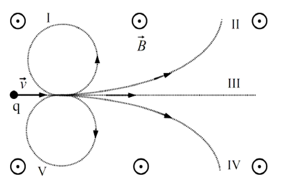 ( ) A partícula da trajetória II possui carga positiva e a da trajetória IV possui carga negativa.