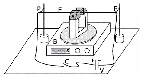 D (UFRGS 2016) No esquema da figura abaixo, o fio F, horizontalmente suspenso e fixo nos pontos de suporte P, passa entre os polos de um ímã, em que o campo magnético é suposto horizontal · e uniforme. O ímã, por sua vez, repousa sobre uma balança B, que registra seu peso.