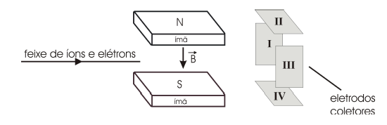 Nessas condições, pode-se afirmar que os íons e os elétrons são desviados, respectivamente,