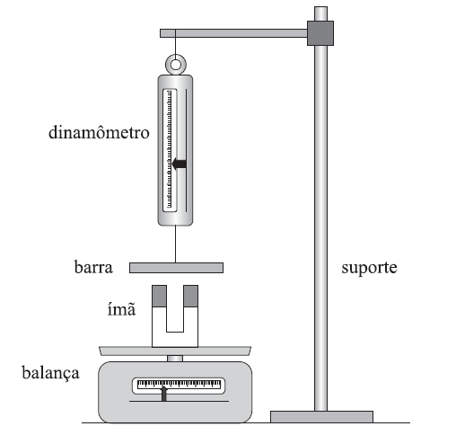 Finalmente, monta o sistema de tal forma que a barra de ferro, presa ao dinamômetro, interaja magneticamente com o ímã, ainda sobre a balança, como mostra a figura.