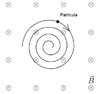 (FORÇA MAGNÉTICA SOBRE CARGAS) A (UDESC 2017) Um campo magnético uniforme está entrando no plano da página. Uma partícula carregada move-se neste plano em uma trajetória em espiral, no sentido horário e com raio decrescente, como mostra a figura.