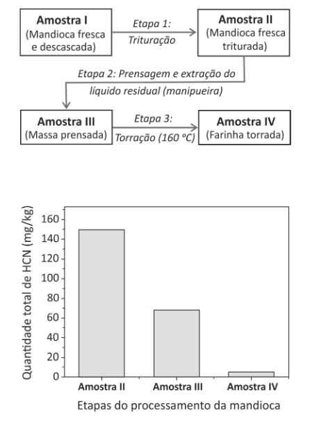Após cada etapa do processamento para a produção de farinha de mandioca seca, representado pelo esquema a seguir, quantificou se o total de HCN nas amostras, conforme mostrado no gráfico que acompanha o esquema.