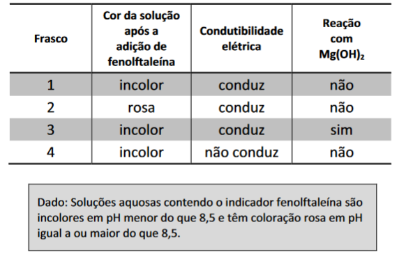 B (FUVEST 2014) Em um laboratório químico, um estudante encontrou quatro frascos (1, 2, 3 e 4) contendo soluções aquosas incolores de sacarose, KCl, HCl e NaOH, não necessariamente nessa ordem. Para identificar essas soluções,fez alguns experimentos simples, cujos resultados são apresentados na tabela a seguir: