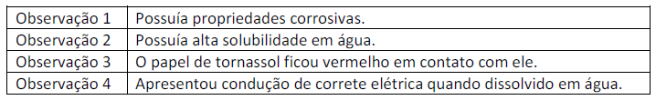 A (UFJF – PISM 1 2017) Um estudante foi ao laboratório e realizou uma série de experimentos para identificar um determinado composto químico. As observações sobre esse composto estão descritas abaixo: