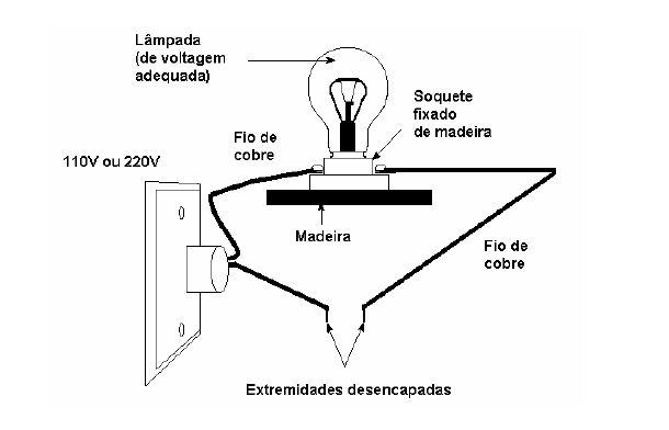 C (UFJF – PISM 1 2010) Para testar se um material é ou não condutor de corrente elétrica, pode-se utilizar uma montagem experimental, conforme apresentado a seguir. É importante lembrar que, na realização do experimento, não há contato direto entre as extremidades desencapadas.
