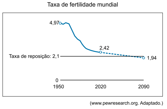 Considerando que a projeção da taxa mundial de fertilidade de 2020 a 2090 seja linear, essa taxa passará a ser inferior à taxa de reposição, pela primeira vez, entre os anos de