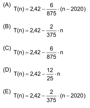 A função do 1o grau que descreve a projeção da taxa de fertilidade mundial (T) para o ano n, com 2020 < n < 2090, é
