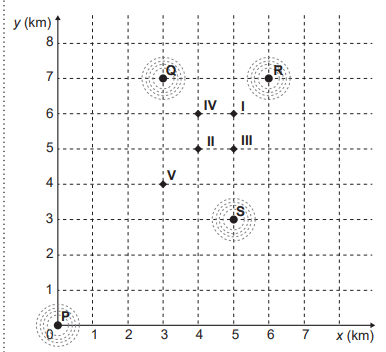 O usuário P define um raio de abrangência com medida de 3 km e busca ampliar a possibilidade de obter um match se deslocando para a região central da cidade, que concentra um maior número de usuários. O gráfico ilustra alguns bares que o usuário P costuma frequentar para ativar o aplicativo, indicados por I, II, III, IV e V. Sabe-se que os usuários Q, R e S, cujas posições estão descritas pelo gráfico, são compatíveis com o usuário P, e que estes definiram raios de abrangência respectivamente iguais a 3 km, 2 km e 5 km.