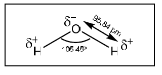 A figura a seguir mostra a geometria da molécula de água com seus respectivos ângulo e comprimento de ligação.