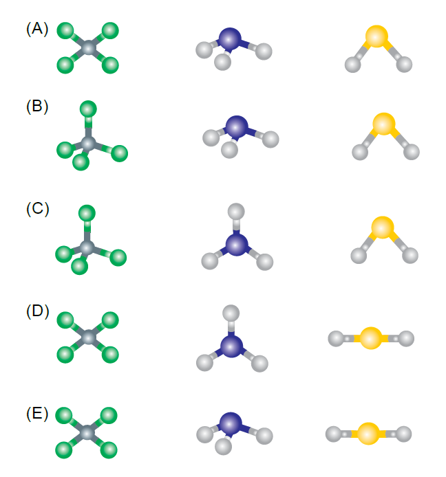 B (FCMSCSP 2019) O tetracloreto de carbono (CCl4), a amônia (NH3) e o sulfeto de hidrogênio (H2S) são substâncias moleculares que apresentam, respectivamente, as seguintes formas geométricas:
