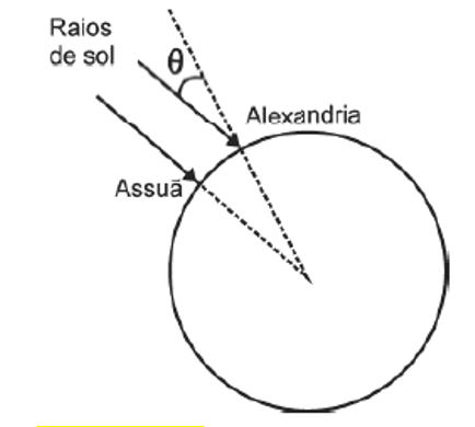 A (FUVEST 2013) Uma das primeiras estimativas do raio da Terra é atribuída a Eratóstenes, estudioso grego que viveu, aproximadamente, entre 275 a.C. e 195 a.C. Sabendo que em Assuã, cidade localizada no sul do Egito, ao meio dia do solstício de verão, um bastão vertical não apresentava sombra, Eratóstenes decidiu investigar o que ocorreria, nas mesmas condições, em Alexandria, cidade no norte do Egito. O estudioso observou que, em Alexandria, ao meio dia do solstício de verão, um bastão vertical apresentava sombra e determinou o ângulo 𝜃 entre as direções do bastão e de incidência dos raios de sol. O valor do raio da Terra, obtido a partir de 𝜃 e da distância entre Alexandria e Assuã foi de, aproximadamente, 7500 km.