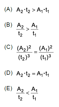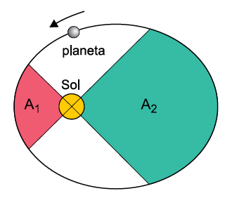 Considerando as proporções entre as áreas indicadas na figura, que a linha imaginária que liga esse planeta ao Sol varre a área A1 em um intervalo de tempo t1 e a área A2 em um intervalo de tempo t2 e sendo válida a Lei das Áreas, de Kepler, é correto afirmar que