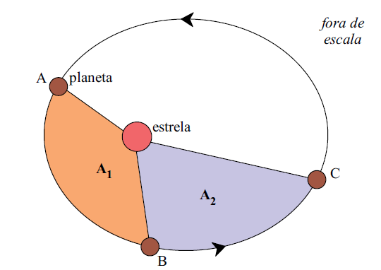 B (UFTM 2013) Num determinado sistema planetário, um planeta descreve um movimento de translação ao redor de uma estrela, segundo a trajetória e o sentido representados na figura. Sabe-se que o deslocamento entre os pontos A e B ocorre em quatro meses terrestres e que as áreas A1 e A2 são iguais.