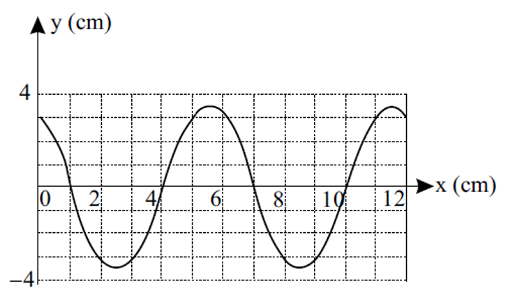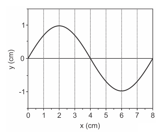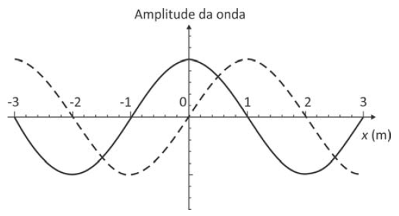 B (FUVEST 2017) A figura representa uma onda harmônica transversal, que se propaga no sentido positivo do eixo x, em dois instantes de tempo: t = 3 s (linha cheia) e t = 7 s (linha tracejada).