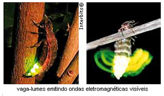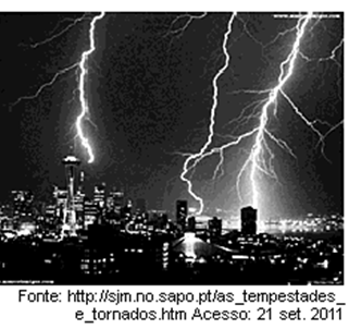 Numa tempestade a queda do raio (descarga elétrica) é acompanhada de um som (o deslocamento do ar gera regiões de compressão e rarefação) e de uma luz (os átomos existentes no ar absorvem a energia elétrica do raio e através de saltos quânticos emitem luz).
