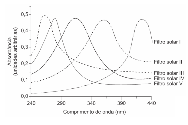 Para selecionar um filtro solar que apresente absorção máxima na faixa UV-B, uma pessoa analisou os espectros de absorção da radiação UV de cinco filtros solares: