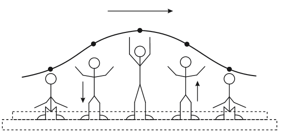 C (ENEM 2013) Uma manifestação comum das torcidas em estádios de futebol é a ola mexicana. Os espectadores de uma linha, sem sair do lugar e sem se deslocarem lateralmente, ficam de pé e se sentam, sincronizados com os da linha adjacente. O efeito coletivo se propaga pelos espectadores do estádio, formando uma onda progressiva, conforme ilustração.